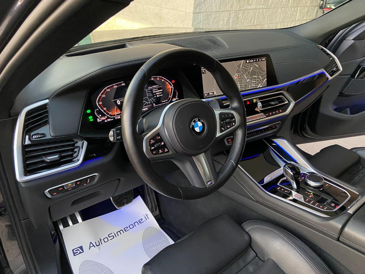 BMW X6 xDrive40d 48V Msport ANNO 03/2022 CON SOLI 57013 KM CERTIFICATI BMW VETTURA IN ECCELLENTI CONDIZIONI FULL OPTIONAL CON IMPIANTO DI SCARICO SPORTIVO ORIGINALE BMW-TETTO APRIBILE/PANORAMICO-BMW GRIGLIA ICONIC GLOW (GRIGLIA ANTERIORE ILLUMINATA)-HEAD-UP DISPLAY-CHIAVE DISPLAY BMW-SOFT CLOSE (ASSISTENZA CHIUSURA PORTIERE)-SHADOW LINE M ESTESA NERO LUCIDO-SPOILER POSTERIORE IN CARBONIO-BARRE TETTO SHADOW LINE-BMW LIVE COCKPIT PROFESSIONAL-NAVIGATORE SATELLITARE CON MONITOR TOUCH SCREEN-BLUETOOTH-CARPLAY/ANDROID AUTO-SENSORI DI PARCHEGGIO ANTERIORI E POSTERIORI-TELECAMERA 360° CON VISTA AEREA-APERTURA E CHIUSURA ELETTRICA DEL BAGLIAIO-FARI LASER ANTERIORI SHADOW LINE M CON ASSISTENZA ABBAGLIANTI-FARI LED POSTERIORI-CERCHI IN LEGA DA 22'' CON PINZE FRENO BLU-MODANATURE INTERNE NERO LUCIDO-INTERNI IN PELLE TOTALE-SEDILI SPORTIVI M A GUSCIO REGOLABILI ELETTRICAMENTE CON MEMORIE, RISCALDABILI, VENTILATI E CON SUPPORTO LOMBARE-SEDILI POSTERIORI RISCALDABILI-VOLANTE IN PELLE MULTIFUNZIONE REGOLABILE ELETTRICAMENTE-CAMBIO AL VOLANTE-CRUISE CONTROLL ADATTIVO CON CONTROLLO ELETTRONICO DELLA CARREGGIATA-PACCHETTO LUCI AMBIENTE MULTICOLORE-COMPUTER DI BORDO-VETRI POSTERIORI OSCURATI-TENDINE PARASOLE POSTERIORI-VETRI ANTERIORI E POSTERIORI A ISOLAMENTO ACUSTICO ECC. POSSIBILITA' DI ESTENDERE LA GARANZIA PER 12/24 MESI A CHILOMETRAGGIO ILLIMITATO VALIDA PRESSO LA RETE ASSISTENZA BMW. POSSIBILITA' DI FINANZIAMENTO A TASSO AGEVOLATO. PER INFO CELL 335/8229775